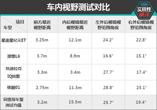 经过测试,极越 01 前视野测试结果突出,处于同级别上游水平。相比之下,此外,三款车型的前视野测试结果都没有达到同级别车型的平均测试水平,前视野盲点略大。在后视线测试中,四款车都超过了同级别车型的平均测试水平。其中,因为 IQ 锐歌配备了流媒体后视镜,后视距离仅为 3.4m,在四款车中排名第一。