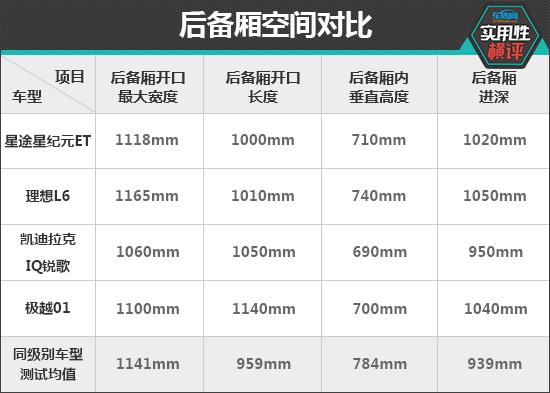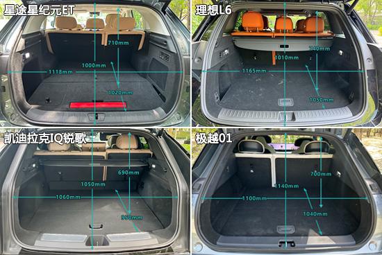 本期参与对比的四款中高档中大型中高档中。 SUV 实际表现并不令人失望。星纪元 ET 在 USB 接口兼容性和停车雷达性能优异;理想 L6 为整车座椅的头枕提供了一个柔软的枕头,值得称赞,后备箱的实用性有目共睹。不幸的是,两侧外后视镜的视野盲点较大,需要改善;IQ 作为老牌豪华品牌车型,锐歌在实用性方面更加注重平衡,它拥有四款车中最大的收纳空间,并配备的流媒体内后视镜能有效减少后视野盲点;极越 01 尽管是这个品牌的第一款车型,但是方向盘调整范围和前方视野盲点的表现还是比较亮眼的,而且在各种测试中都有很好的发挥。总的来说,四款车在实用性方面都没有明显的短板,用户可以根据需要安心购买。