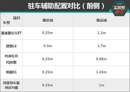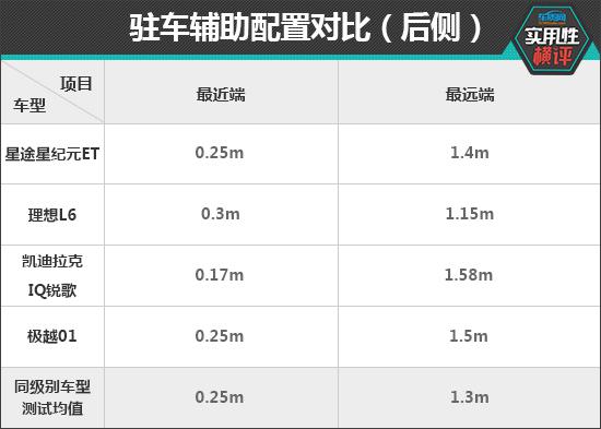 在停车辅助配置方面,根据以往的检测经验,持续蜂鸣阶段越接近 0.25m 更接近日常使用习惯。前驻车雷达检测中,星纪元 ET、IQ 锐歌和极越 01 最近的提醒距离与测试经验完全一致,表现出色。但是就最远的探测距离而言,理想 L6 和极越 01 测试结果大大超过了同级别车型的平均测试结果,雷达功率表现良好。