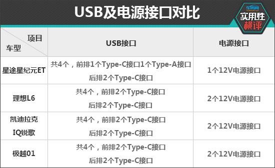 在充电插座数量方面,四款车都配备了充电插座。 4 个 USB 接口,前后排分布均匀。其中,理想 L6、IQ 锐歌、极越 01 三款车型的 USB 接口均是 Type-C 单一规格,对充电设备的兼容性缺乏。而星纪元 ET 前排提供了 1 个 Type-C 接口和 1 个 Type-A 接口,能满足车内乘客对不同设备的充电需求。另外,四款车都配备了 12V 电源接口,实用性能令人满意。