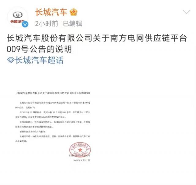 另一个是长城汽车官方微博发布的《南方电网供应链平台》 009 号码公告的解释。