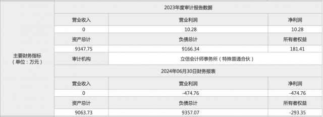 财务指标方面,截至 2024 年 6 月 30 当天,目标企业没有营业收入,净亏损 474.76 一万元;公司资产总额 9063.73 一万元,债务总额 9357.07 万元,所有者权益 -293.35 万元。