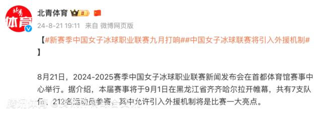 北京时间 8 月 21 日,2024-2025 本赛季中国女子冰球职业赛新闻发布会在首都体育馆赛事中心举行。据报道,本次比赛将在首都体育馆举行。 9 月 1 日本在黑龙江省齐齐哈尔拉开幕,共同开幕。 7 支队伍、212 著名运动员参加比赛,其中允许引入外援机制将是比赛的一大亮点。