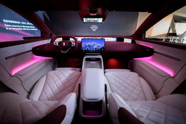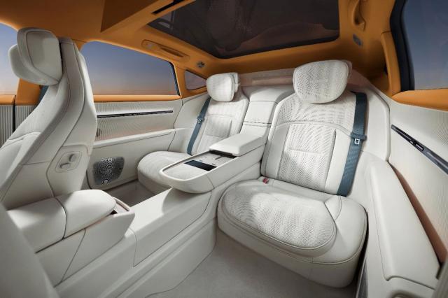 座舱选用 Kim Jones 收藏风格的内饰,全粒面 Nappa 植鞣真皮座椅有舒适的乘坐体验。此外,大屏幕贯穿车内,后舱悬浮天慕屏,英国珍宝音响系统,具有很强的现代感。有了灵感,细节和仪式感都充满了。