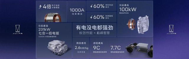 阿维塔科技与宁德时代携手打造,面对传统增程汽车馈电情况下动力严重下降的痛点, 39kWh 神行很增混电池,在满电状态下拥有。 9C 即使在低电量的情况下,峰值放电倍率也能保持。 7.7C 高峰放电倍率。阿维塔即将发布。 07 增程四驱车型,甚至在馈电下也有 5.8 秒的零百加速成绩。