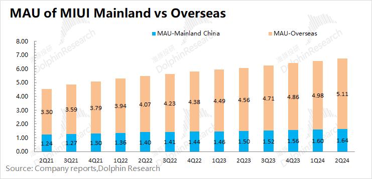 MIUI 用户数量:截至2024年6月,MIUI 每月活跃用户数达6.76亿,比去年同期增长11.5%,MIUI客户增长率在本季度有所回升,用户数量保持两位数的扩张速度。