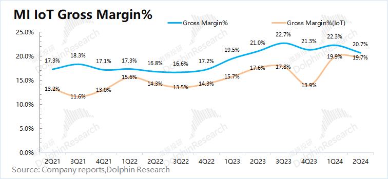 2024年第二季度,小米集团毛利率为20.7%,同比下降0.3%。pct,优于市场预测(19.7%)。