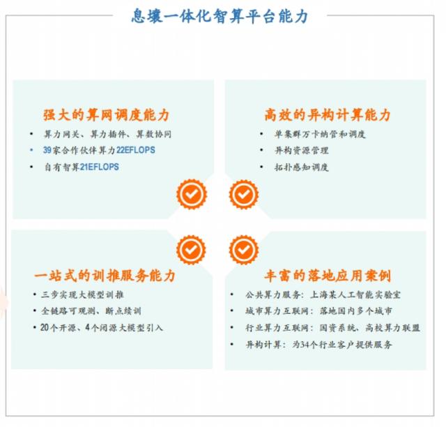 除了自己拥有的,这还不是全部。 21EFLOPS 智能化计算率,中国电信也携手 39 家庭产业链合作伙伴合作,合作伙伴 22EFLOPS 计算率接入中国电信一体化智能计算服务体系。因此,中国电信拥有 40 多 EFLOPS 智能化计算率为客户提供服务。