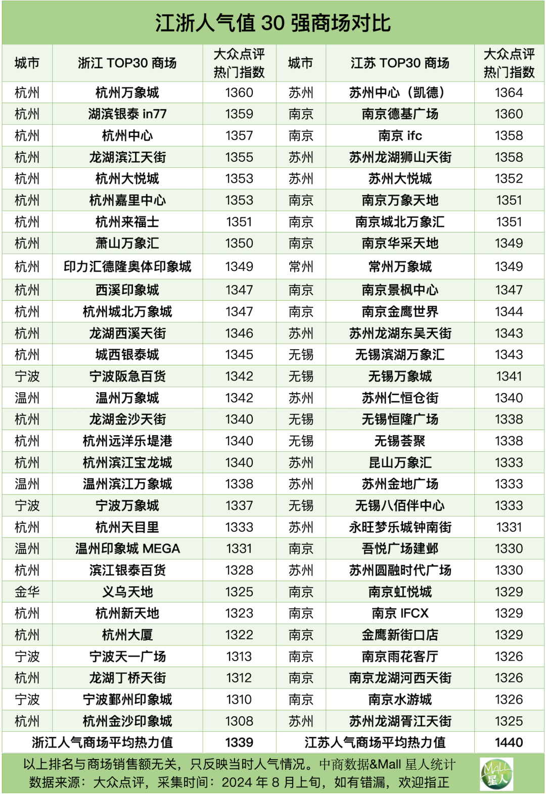 江浙8月初热值最高的30强商场之一,由大众点评热门指数统计而成,南京ifc、义乌天地,常州万象城,华润万象生活,都是今年新开业项目中的佼佼者。