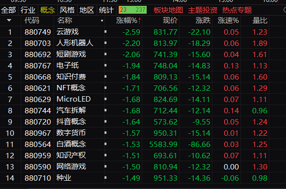 盘面上,银行股保持强势,中国银行、工商银行、建设银行均再创历史新高,上海银行等多芯再创新高。ST板块逆势活跃,*ST景峰、ST百利、*ST富润、*ST通脉等10多股涨停。固体电池概念股再次上涨,鹏辉能源,盟固利涨停。服装、户外用品概念股盘内变动,探路者、三夫户外、日播时尚涨停。在下跌方面,游戏股集体调整,华谊兄弟下跌超过10%。板块方面,ST板块、银行板块、服装板块、固态电池板块涨幅居前,游戏板块、白酒板块、电商板块、机器人板块跌幅居前。
