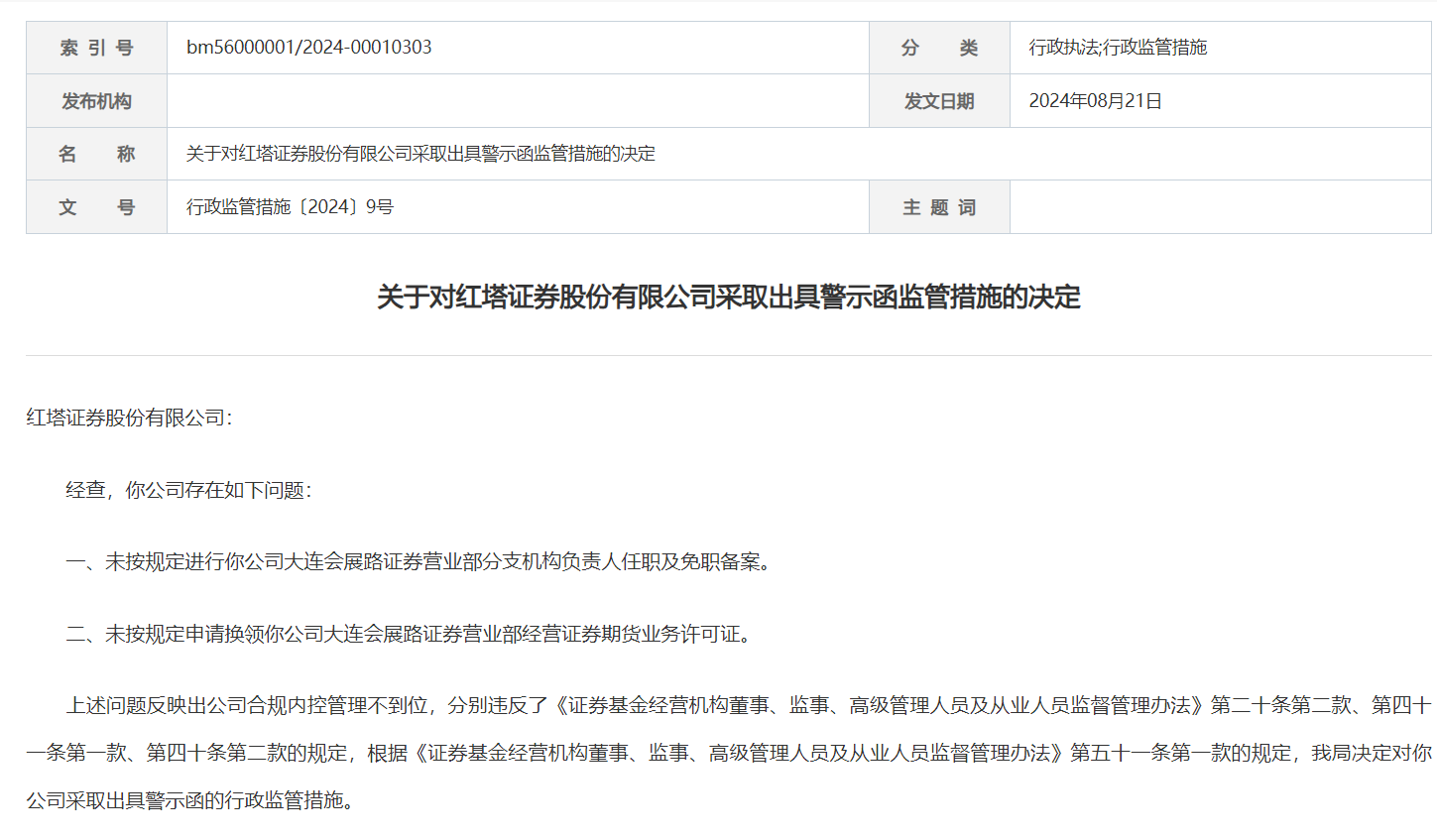 大连证监局指出,上述行为违反了《证券基金经营机构董事、监事、高级管理人员和从业人员监督管理办法》第二十条第二款、第四十一条第一款、第四十条第二款的规定,根据《证券基金经营机构董事、监事、高级管理人员和从业人员监督管理办法》第五十一条第一款的规定,决定对红塔证券采取行政监督措施,出具警示函。