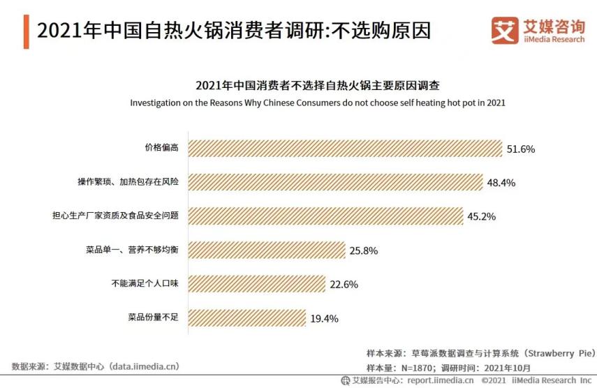2021年艾媒咨询调查显示,"价格偏高"这是消费者不选择自热火锅的主要原因。