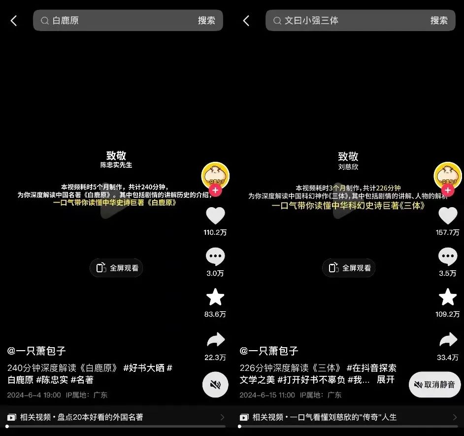 从六月份开始,他连续发布了几十个超长的视频讲解,涵盖了古今中外的小说,如《红与黑》、《三体》、《白鹿原》、《长安的荔技》等。其中,视频《白鹿原240分钟深度解读》在抖音获得了110多万赞,视频《三体226分钟深度解读》在抖音获得了超过157万赞,播放量达到6000万。