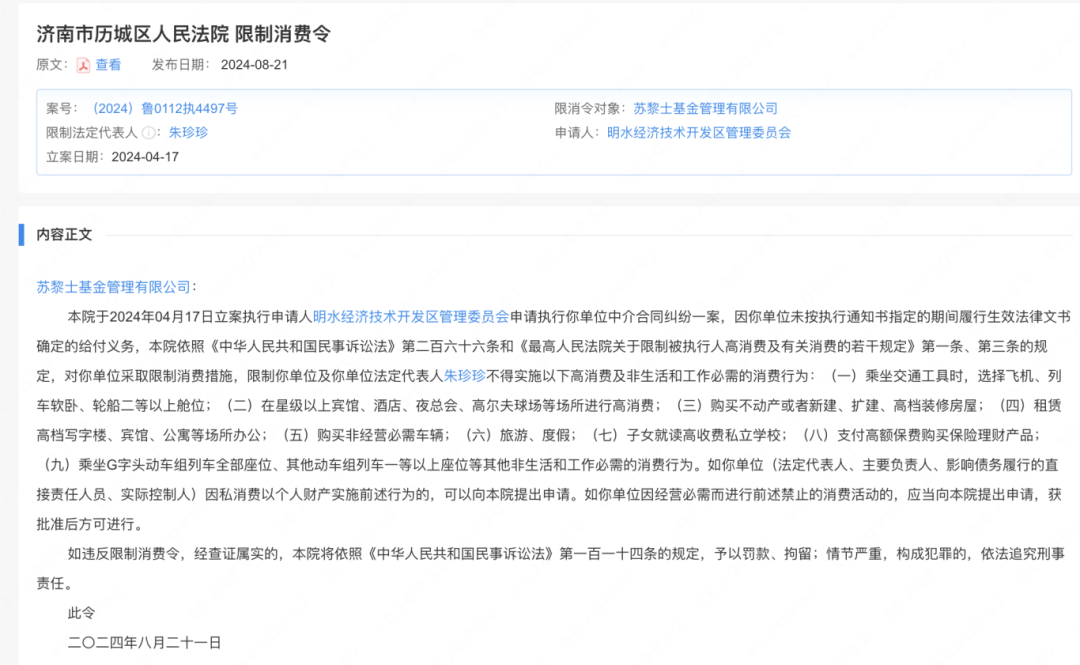 这是什么情况?苏黎士基金管理有限公司(以下简称苏黎士基金)近日不仅因250多万执行标准被列为不可信执行人,还因高消费受到限制!