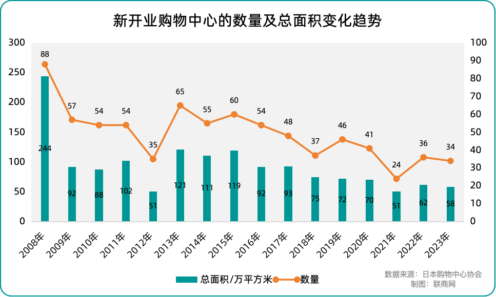 2023年,日本迎来了34个全新的购物中心,与2022年的36个购物中心相比,这一数字略有下降,仅高于2021年的24个历史低点。这一趋势反映了疫情对实体经济的不断挑战,尤其是大型商业综合体的建设和运营。