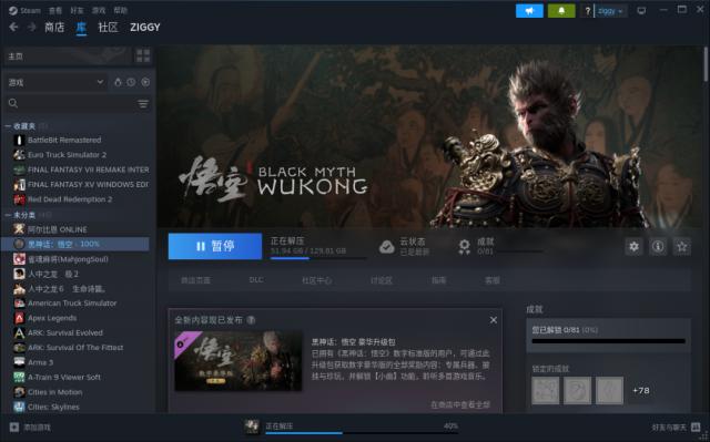 安装完成后,第一次开启。 Steam 检验将开始更新,登录帐户并进入帐户 Steam 之后搜索“黑神话:悟空”,就可以找到相应的游戏,并购买游戏。
