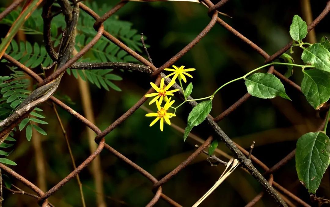 铁网上的变色树蜥蜴,盛开的千里光和攀爬纠缠的使君子。南兆旭摄