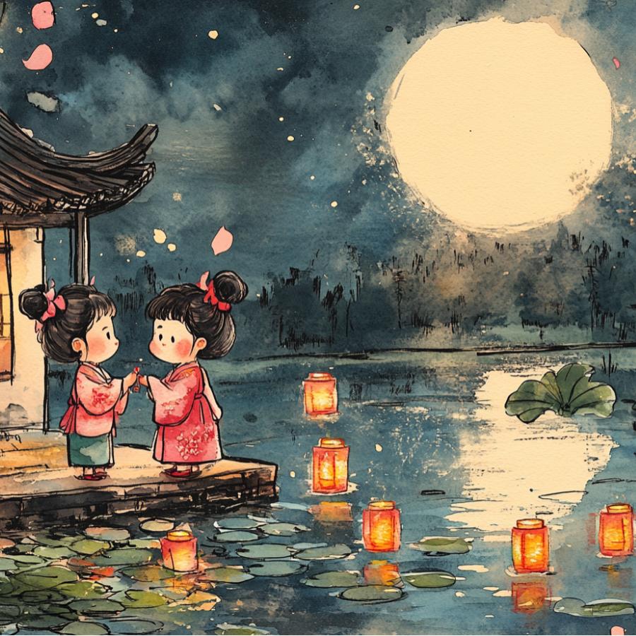 河灯又称“荷花灯”,一般是在底座上放灯或蜡烛,中元夜放在河流和湖泊中,让它漂浮。