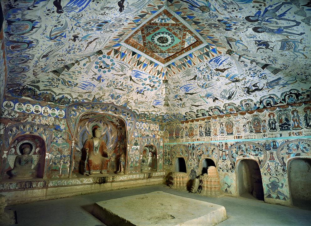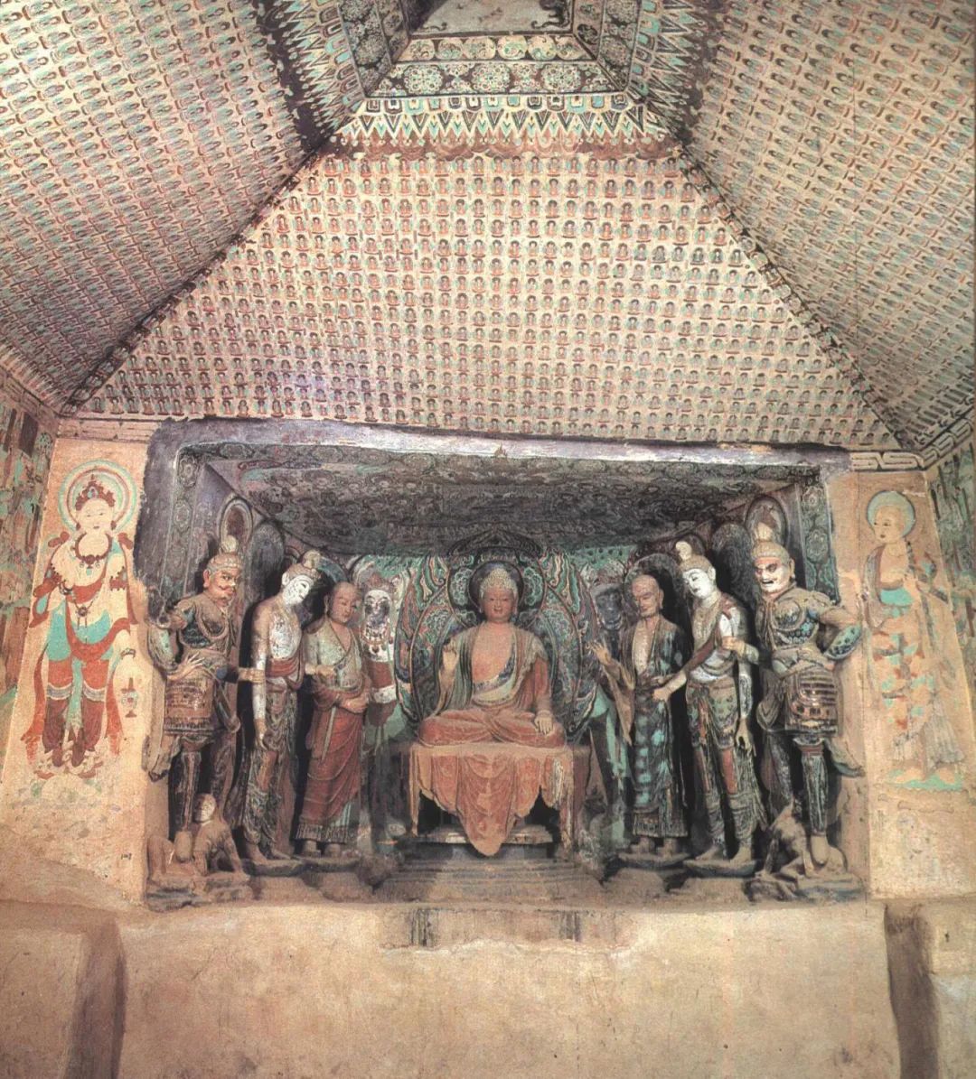 第285窟位于莫高窟中间的二楼。主室为顶方形洞穴,洞穴正壁(西壁)中央大龛为塑善坐佛,两侧小龛为禅僧雕像,左壁(南壁)。、右壁(北壁)有四个禅窟。这个洞保存完好,右壁有四五年的西魏大统(538)、五十三十九年)的造窟题记数方,是莫高窟最早有一年历史的洞穴,对莫高窟的历史和艺术研究具有重要意义。