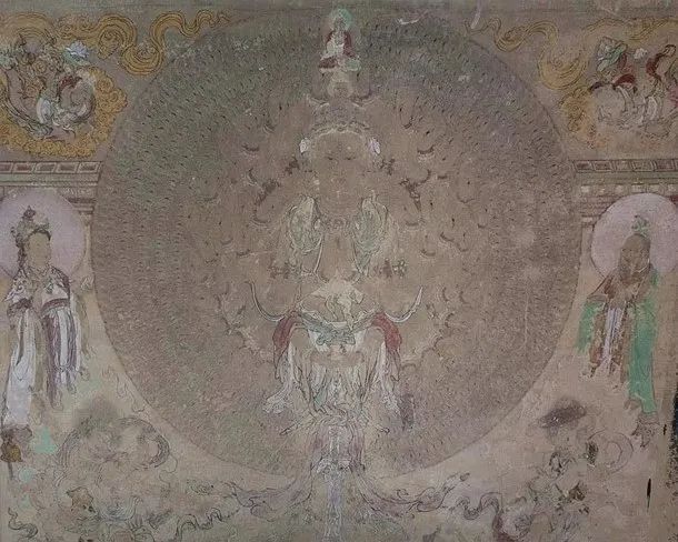 在元朝晚期,莫高窟第三窟是最重要的代表窟,也是敦煌唯一以观音为主题的洞穴。这个洞穴左(南壁)、右(北壁)两壁各画千手观音,均以正面相为主体,左右各画侧面相,画像用焦墨勾勒,色彩优雅,造型蕴含,端庄;特别值得称赞的是丰富多彩的线描,衣服像兰叶,比如折芦,人物的外貌和四肢都是用高挺浑厚的铁线描……中国人物画的线描几乎已经聚集在一起了。