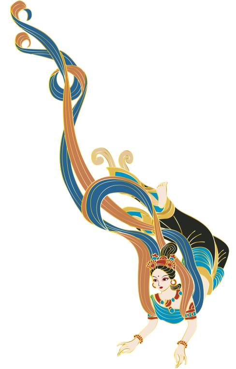 这个洞穴南壁的阿弥陀佛说法图上部有两列飞天。前两个身体对称地支撑在华盖的左右两侧,一只手撒花,一只手接引,身材婀娜多姿,飘带跃然有声,后两个身体的飞天对称紧随其后,也是撒花接引的趋势。长长的飘带衬托出飞行中轻盈灵动的身材。整个画面由飞天和流云组成,色彩绚丽,生动地展现了西方极乐世界的奇妙境界。它是莫高窟唐朝飞天的代表作之一,被常书鸿先生称为“最美的飞天”。