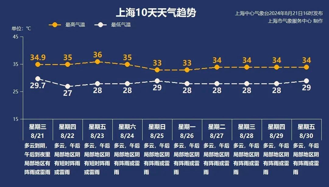 从周六到周六,上海将保持高温。与上一波相比,这波高温强度较弱,极端最高温度在36℃周围,但夜温不低,多在28~29℃。此外,空气湿度高,闷热的感觉会非常明显。建议大家尽量避免在高温时段进行长期户外活动。如果需要出门,要做好防暑降温工作,谨防中暑和热射病。