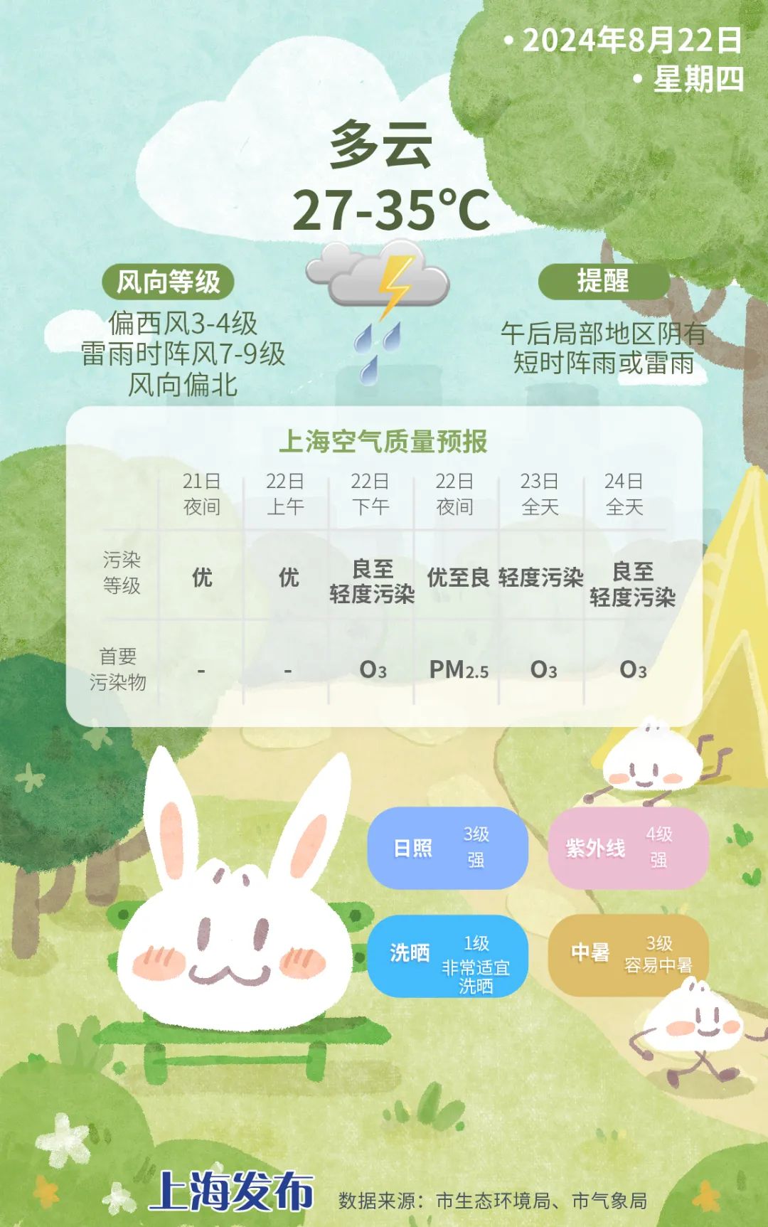 今日阴天,下午部分地区有短时阵雨或雷雨,偏西风3~4级,相对湿度为90%~50%,温度为27~35℃,体验不舒服,防暑降温工作还要继续。