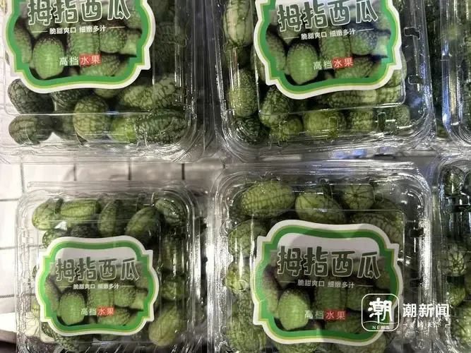 在另一家超市,记者看到了拇指西瓜的真实面貌,表面与普通西瓜非常相似。它的大小只有拇指盖的大小,一盒125克,售价19.9元,约80元一斤。据工作人员介绍,这种水果虽然叫拇指西瓜,但其实里面没有西瓜果肉,味道更像黄瓜。买家主要是好奇。记者也尝过了。拇指西瓜的味道真的有黄瓜的味道。