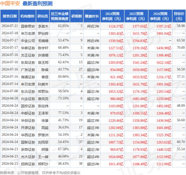 根据近三年发布的研究报告数据,中国邮政证券王泽军研究员团队对该股进行了深入研究,近三年平均预测准确度为 预测77.53% 2024 年度归属净利润为利润 979.05 十亿,根据现价转换预测。 PE 为 7.54。