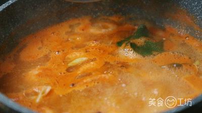 3. 将大虾炒熟,加入开水煮沸,香菇、柠檬叶、小米椒、红咖喱煮开。