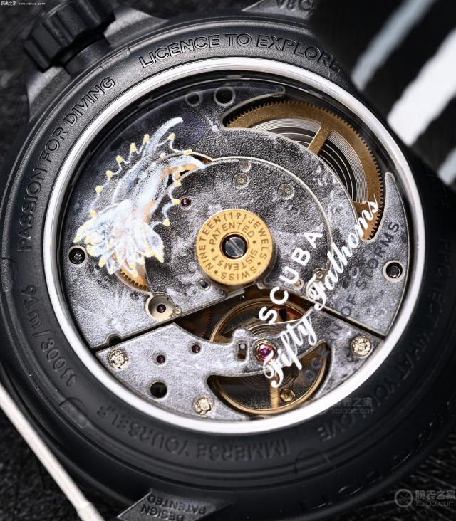 连斯沃琪集团 Nivachron 钛游丝全部使用(抗磁突出),动力 90 每天都能达到走时偏差。 -5/ 15 秒。背面印着海洋动物的图案,非常漂亮。