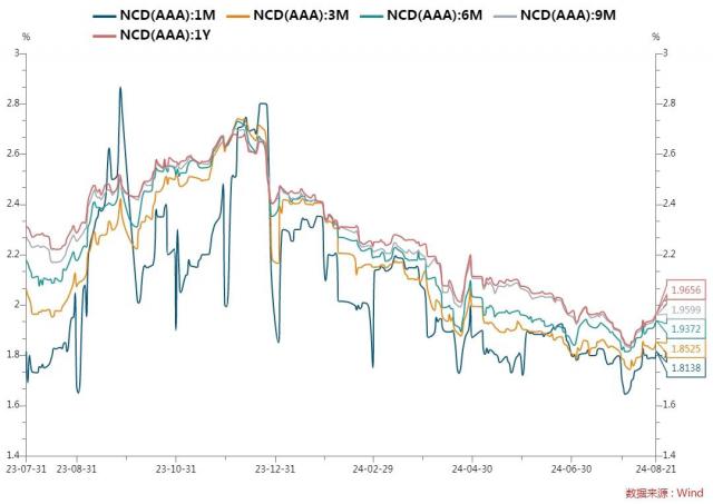 国有和主要股份制银行一年期同业存单二级最新交易在一年期 1.97% 上下。