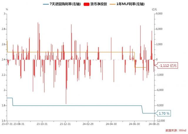 央行 8 月 22 日以固定利率、数量招标方式进行 3593 亿元 7 天期逆回购操作,操作利率为 1.7%。Wind 数据显示,当天 5777 逆回购到期1亿元,由此计算,单日净回笼 2184 亿元。
