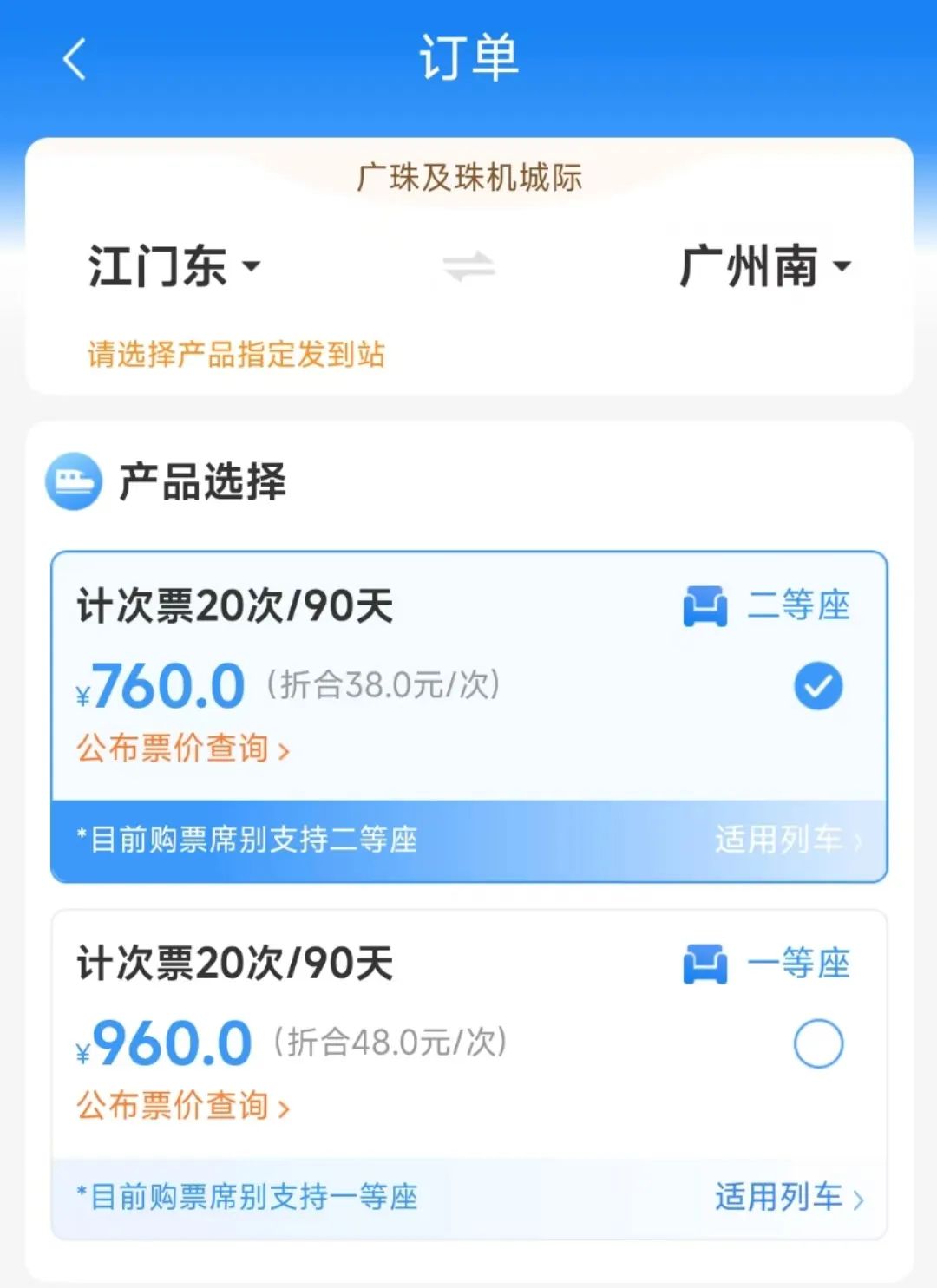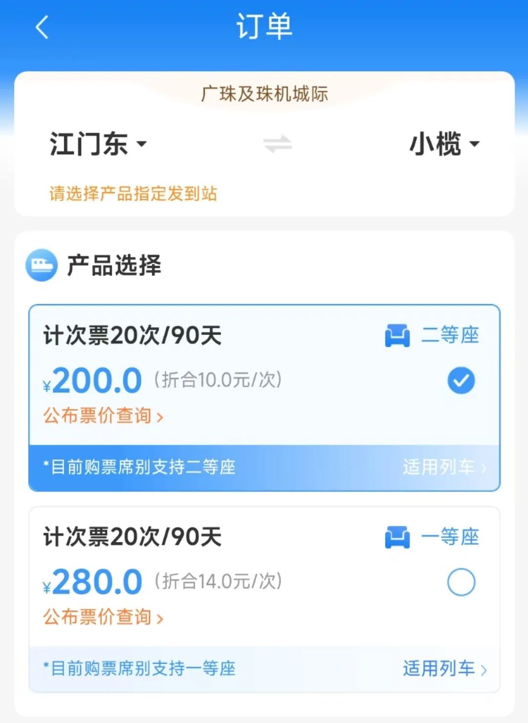 同样,以二等座位为例。从江门东站在小榄站,90天内20次定期票合计200元,换算成10元/次。与购买一张票的价格相比,几乎相同。但是,如果选择一等座位,单次旅行可以节省1元。