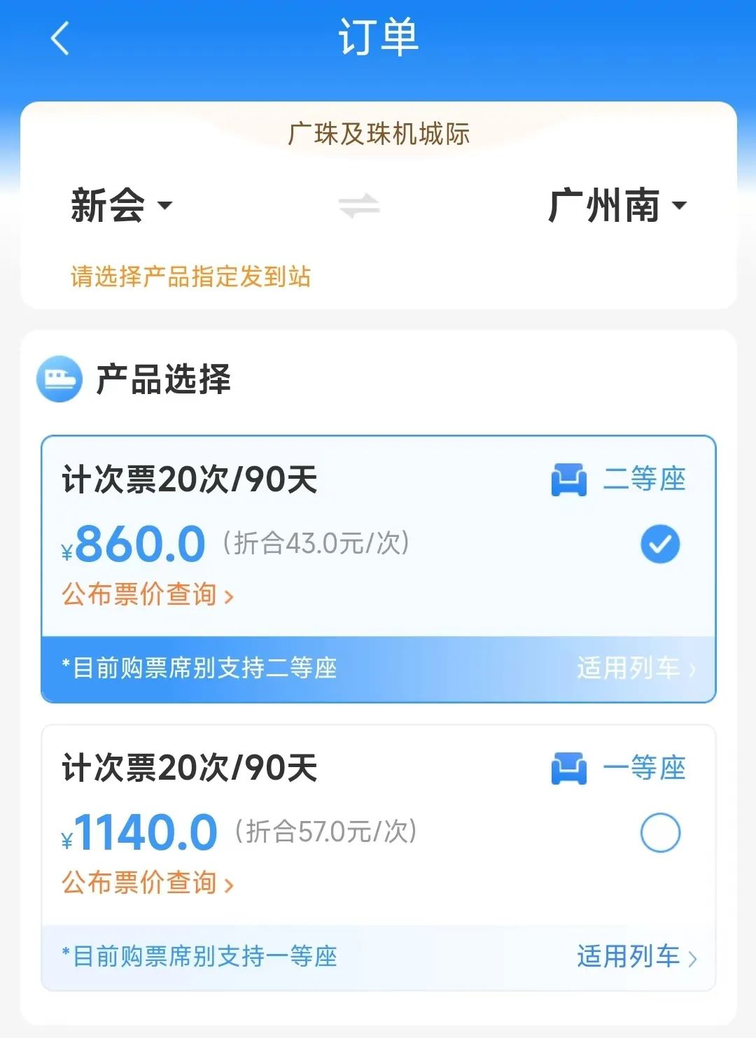 同样,以二等座位为例。新会站在广州南站,90天内20次定期票合计860元,折算为43元/次。与购买一张票的价格相比,一张票可以节省2元。