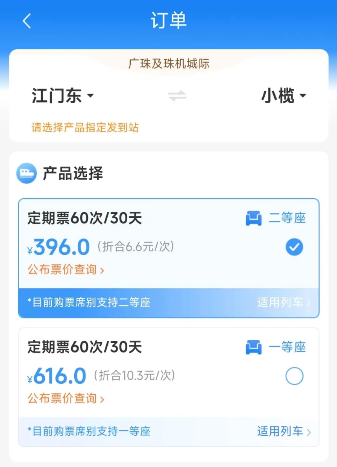 记者从12306网站了解到,自8月20日起,广珠城际和珠机城际公开出售计次票和定期票。售票系统显示,定期票30天乘坐60次,90天乘坐20次(包括一等座和二等座)。