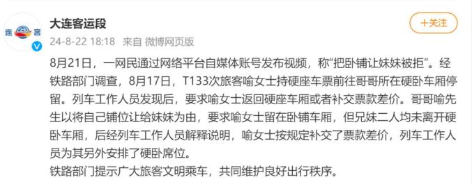 八月二十一日,一位网友通过网络平台自媒体账号发布视频,称“让妹妹卧铺被拒绝”。