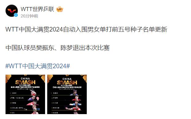8月27日,WTT世界乒乓球联合会官方博客发布WTT中国全满贯2024年男女单挑前五名种子名单自动更新,中国球员樊振东和陈梦退出本次比赛。[点击查看详细信息]-观看云南-
