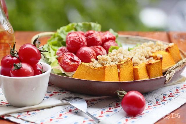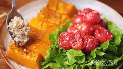 藜麦是一种非常优质的高蛋白食品,再配上香甜、软糯的烤南瓜、酸甜的圣女果和酥脆的生菜,美味可瘦。