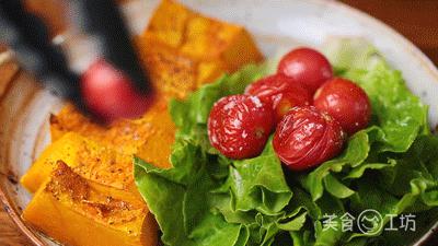 南瓜和小番茄已经调好了味道,可以适度加入一些柠檬汁。新鲜、美味、饱满的减脂餐就完成了。不得不说,甜南瓜加一点盐,味道瞬间上升到更高的水平。