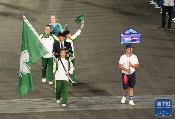 ↑在开幕式上,中国澳门体育代表团进场。新华社记者 侯昭康 摄