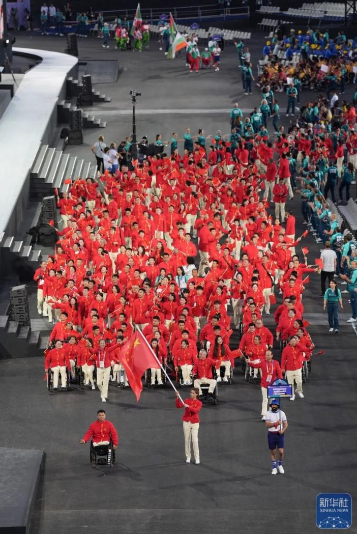 ↑开幕式上,中国体育代表团旗手男举重运动员齐勇凯(前左)和女子轮椅击剑运动员辜海燕(前中)。新华社记者 才扬 摄