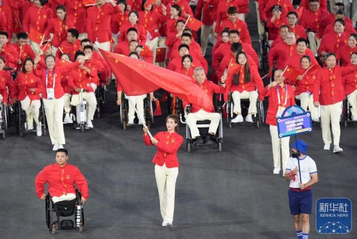 ↑开幕式上,中国体育代表团旗手男举重运动员齐勇凯(前左)和女子轮椅击剑运动员辜海燕(前右)。新华社记者 熊琦 摄