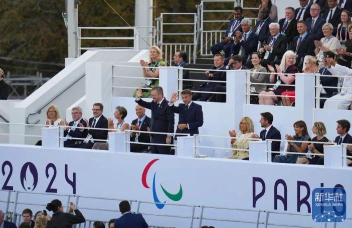 ↑安德鲁·帕森斯(前排左六)和法国总统马克龙(前排左七)国际残奥委会主席向观众问候。新华社记者 侯昭康 摄