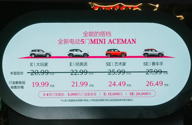 全新电动 MINI Aceman 提供 4 一款车型,分别是大玩家、经典派、艺术家和赛车手,相应的价格是 19.99 万元、21.99 万元、24.49 万元和 26.49 一万元(此价格为定金膨胀后的销售价格,有效期为即日至即日。 2024 年 9 月 30 日(含))。