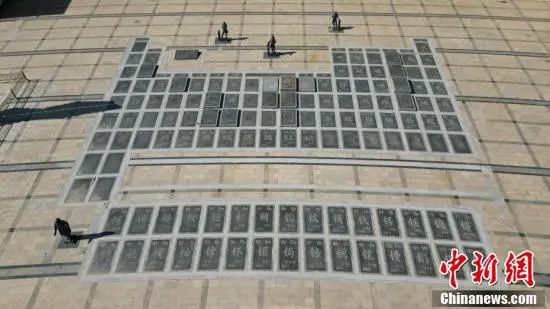 甘肃省金昌市位于河西过道中部,被誉为“河西咽喉、丝路孔道”。它是一个新兴的资源型工业城市,因生产镍而被称为“中国镍都”。2023年,金川集团镍产量居世界第三,钴产量居世界第五,铂族金属产量居亚洲第一,铜产量居世界第四。在金川科技馆,展厅以金属科普知识的应用、地球的起源和丰富的矿物质、金属的整个冶炼过程为主线,从全球角度展示了人类工业文明的成就。图为金川科技馆广场前的大理石雕刻元素周期表。十几块凸出的地砖包括镍、铜和金川集团矿床中的稀有金属、浣熊和浣熊。
