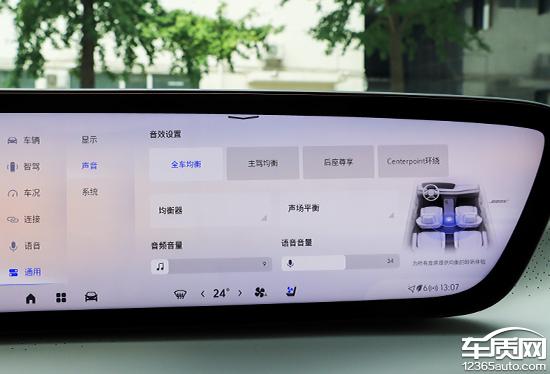 评测车配置 BOSE 音响系统,拥有 12 一个音箱,配备表现中规中矩。除了音效设置部分, Centerpoint 围绕,还可以选择整车平衡、主驾平衡、后座专属。此外,还可以手动调节平衡器和音场平衡,可玩性强。