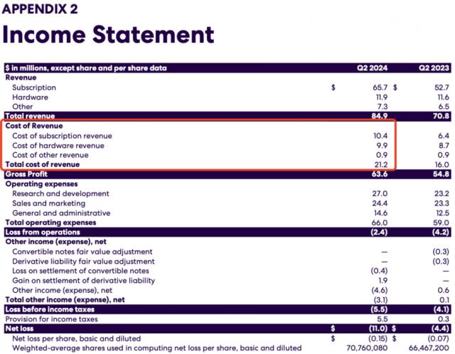 Life360 收入来自三个业务,订阅服务,硬件销售和其他业务。 2024 第二季度财务报告,收入分别为 6570 万美金、1190 万美金以及 730 一万美元,占季度收入的 77%、14% 及 9%。从利润率来看,订阅业务是主要推动者。订阅服务的利润率 只有80%的硬件业务, 20%。
