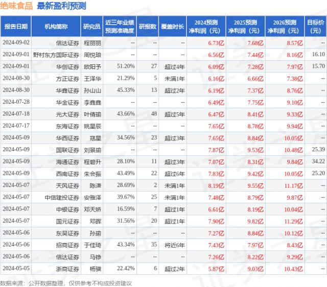 2024Q2 企业毛利率为 同比增长30.6% 8.2pct,主要原因是鸭副原料价格明显提高,2024Q1 企业毛利率为 第二季度环比继续恢复30.0%。公司 2024Q2 销售费率为 同比增长10.0%。 2.6pct,主要原因是广告费用增加; 保持相对稳定的7.0%。公司投资收益方面 2024Q2 实现收益 0.11 亿元,同比下滑 12.7%,而 2024Q1 亏损 0.14 亿元,投资收益环比顺利扭亏为盈。公司 2024Q2 归母净利 1.31 亿元,同比增长 实现稳定增长的25.1%。