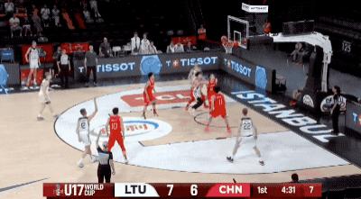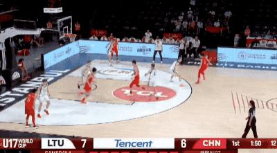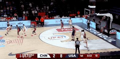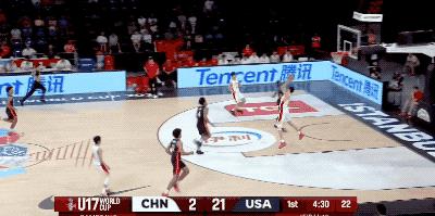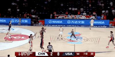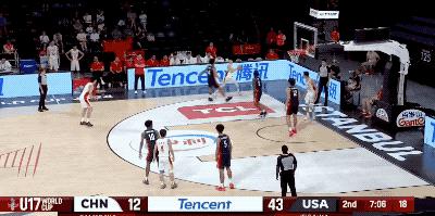 还有对美国的战斗 U17 比赛中,张博源唯一的运动战对合进球,也是一个结合无球跑动和假动作摇摆防守的中投。